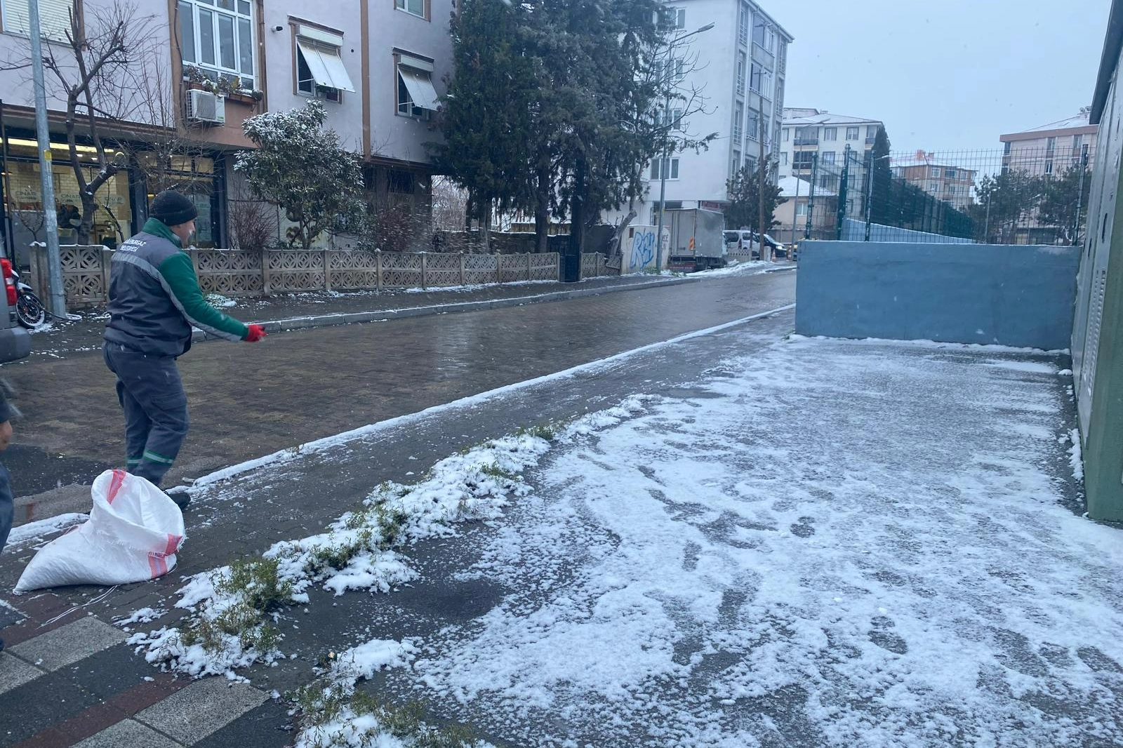 Ekipler, çarşı bölgesinde ve okul önlerinde de buzlanmaya karşı önlem aldı.