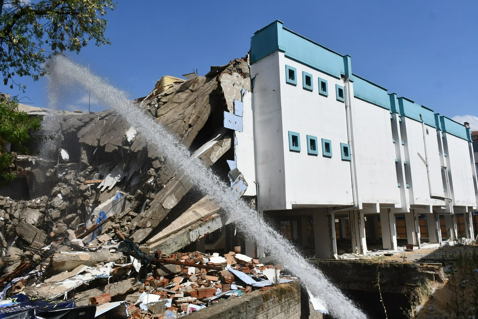 İtfaiye ekipleri de toz oluşumunu engellemek amacıyla yıkım bölgesine su sıktı.