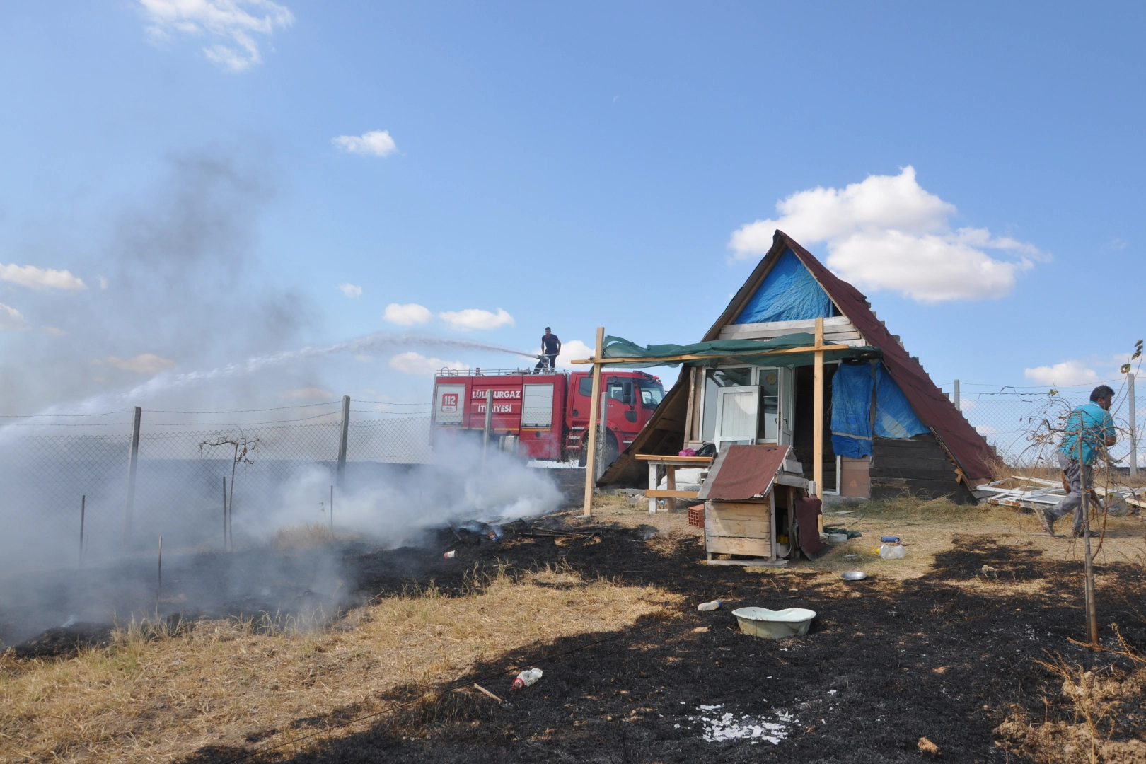 Yangında yaklaşık 5 dönüm alan ile bir bağ evinin bahçesindeki tarım aletleri zarar gördü.