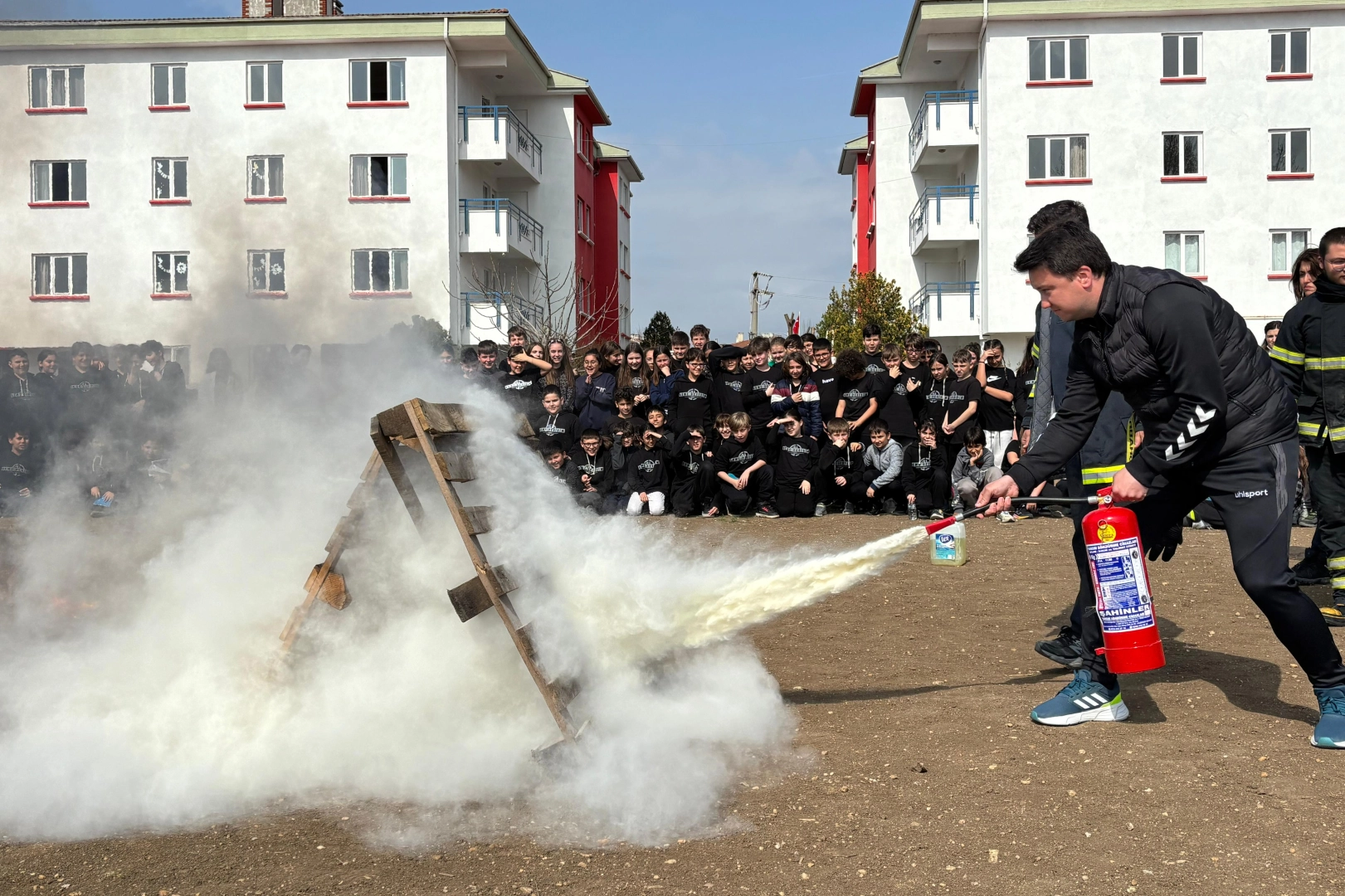 Daha sonra itfaiye ekiplerince okul bahçesinde yangın tüpü kullanımı ve yangına müdahale eğitimi verildi.