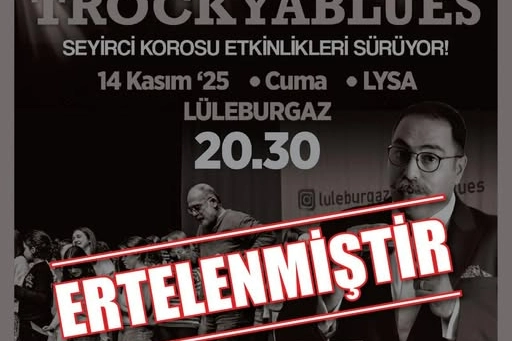Lüleburgaz Belediyesi tarafından 14 Kasım 2025 tarihinde düzenlenmesi planlanan Trockyablues Seyirci Koroları etkinliği, şehitlerimiz nedeniyle ileri bir tarihe ertelendi.
