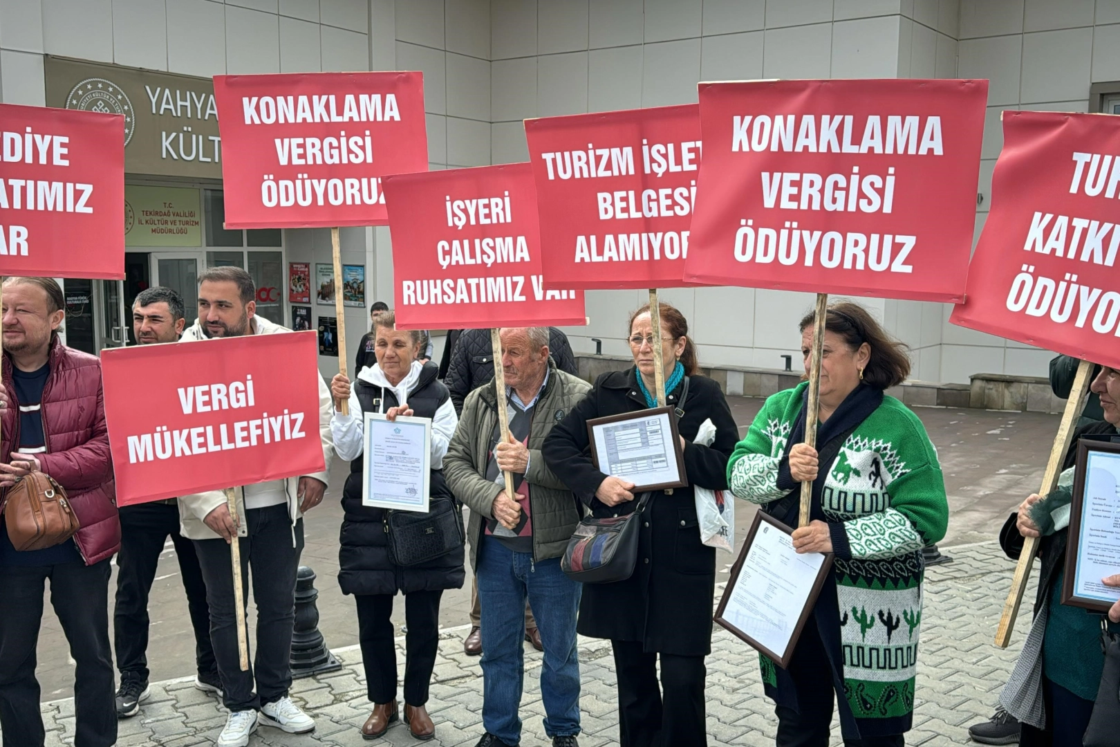 Kültür Turizm Bakanlığı tarafından çıkartılan Turizm İşletme Belgesi yönetmeliği sonrasında Tekirdağ’ın Süleymanpaşa ilçesinde kapatılması beklenen 63 pansiyon işletmecisi Kültür Turizm İl Müdürlüğü önünde basın açıklaması yaptı. Pankartlar ile Kültür Turizm İl Müdürlüğü önüne gelen işletmeciler, çıkartılan yönetmelikle mağdur olduklarını, belgeyi alamadıklarını ve mağduriyetlerinin giderilmesini talep etti. Konuyla ilgili açıklama yapan İşletme sahibi Gökhan Taşkıran, “Bizler Tekirdağ’da konaklama faaliyeti gerçekleştiren işletme sahipleriyiz. Bizler bu işletmeler bizim ailelerimize ait apartmanlarda ya da kiraladığımız yerlerde konaklama faaliyeti gerçekleştiren işletmeleriz. Bu alan da çalışırken bizler, belediyeden iş yeri açma ve çalıştırma ruhsatlarını almış bulunmaktayız, bağlı bulunduğumuz vergi dairelerinden vergi levhamızı almış durumundayız, aynı zamanda çalıştırdığımız arkadaşlarımızın SGK gibi yükümlülüklerini yapmış bulunuyoruz. Aynı zamanda konaklama faaliyetli işletmelere getirilen Konaklama vergilerini ödüyoruz. Turizm katkı payı vergisini ödüyoruz. Fakat bakanlığımızın son dönemlerde çıkartmış olduğu Turizm İşletme Belgesini maalesef ki alamıyoruz. Bunun için de ilçe belediyesi, il turizm müdürlüğü arasında maalesef git gel yapılmak suretiyle oyalanıyoruz. Bizler vergisel anlamda tüm yükümlülüklerimizi yerine getirmemize rağmen maalesef ki bu turizm işletmesi belgesini alamıyoruz ve yıllardır çalıştırdığımız, alın teri döktüğümüz işletmelerimizin kapanması gibi bir durumla karşı karşıyayız. Biz buradan mağduriyetimizin giderilmesini istiyoruz” dedi. Taşkıran, “Turizm Bakanımız Mehmet Nuri Ersoy’un televizyonlara çıkıp bizleri durumda bırakacak bu yönetmeliği anlatırken kullandığı kelimeleri size söylemek istiyorum. Diyor ki ‘Siz bir konutta yaşıyorsunuz, düşünsenize yan dairenize hiç tanımadığınız kişiler girip çıkıyor. Bunların kayıt altına alınması gerekiyor’ deniliyor. Burada ki işletme sahiplerinin hepsi kayıt altında, kolluk denetimi altında biz bu faaliyetleri yürütüyoruz. Sonrasında konuşmasında şunu söylüyor, ‘’Giren çıkan kişinin kimlik bildirimi yapılmıyor’ deniliyor. Ama bizim işletmelerimizin hepsinde Online kimlik bildirim sistemine sahibiz. İşletmelerimizde konaklayan tüm misafirlerin kimlik bildirimleri anlık yapılıyor. Kayıt dışılıktan ve vergi kaybından bahsediyor bakanımız haklıdır ama yine burada ki işletmelerin tamamı vergi mükellefidir. Dolayısıyla Sayın Bakanımız bunu aslında 100 daireli, 200 daireli büyük rezidanslarda günlük kiralama yapılan yerleri kayıt altına alınması maksadıyla yapılırken bu yönetmelik, bizim gibi ufak konaklama faaliyetli işletmeleri de kapsayarak mağdur etmektedir. Biz sayın bakanımızın niyetini derdini çok iyi anlayabiliyoruz ama bizim gibi ufak yerlerin de bu yönetmeliğe sokulmasıyla bizleri mağdur ediyor. Biz bu mağduriyetimizin giderilmesi hususunda gereğini rica ediyoruz" diye konuştu. Pansiyon İşletmecisi Cüneyt Demir ise, “Bizim ruhsatlarımızda günü birlik konaklama evi yazıyor. Hal bu ki diğer ilçelerde olduğu gibi pansiyon ruhsatı verilmiş olsaydı zamanında. Burada ki insanların hiç birisinin bir mağduriyeti olmayacaktı. O zaman biz basit konaklama belgelerimizi alacaktık, basit bir şekilde çözecektik. Ama bugün ne Süleymanpaşa Belediyesi bu konuda adım atıyor, ne de bakanlık bu konuda çözüm üretiyor. Biz de ortada kurbanlık koyun gibi bekliyoruz. Ne zaman gelip işletmelerimizi kapatacaklar, mühürleyecekler diye. Şöyle bir durum var, yaz geliyor, bir dünya insan geliyor bunların konaklaması var bu anlamda da sıkıntı var. Bizi mağdur ediyorlar ama her hangi bir alt yapı hazırlıkta yok. Nerede konaklayacak insanlar" ifadelerini kullandı. Yönetmeliğin çıkması sonrası mağdur olan işletme sahipleri, basın açıklamasının ardından sessiz bir şekilde dağıldılar.