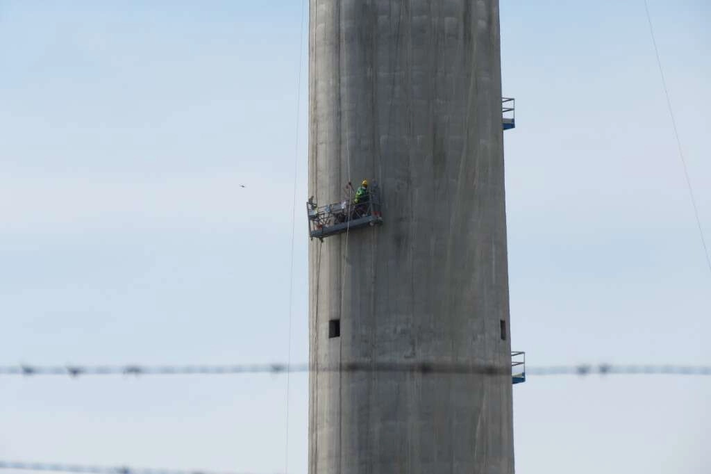 Büyükkarıştıran beldesinde faaliyet gösteren cam fabrikasının 100 metrelik fırın bacasının boyanması için asma iskele kuruldu.
