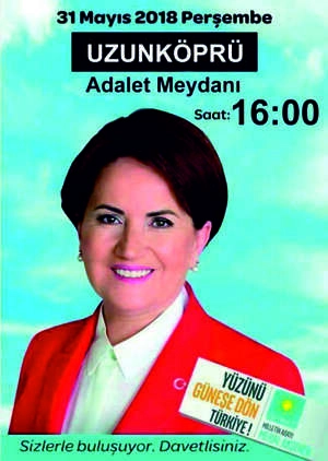 iyi Parti Genel Başkanı ve Cumhurbaşkanı Adayı Meral Akşener 24 Haziran seçimleri kapsamında 31 Mayıs Perşembe günü saat 16:00'da Uzunköprü'de vatandaşlarla buluşacak. Akşener'in Uzunköprü Adalet Meydanında yapacağı mitinge yoğun bir katılım olması bekleniyor. iyi Parti Havsa ilçe Başkanı Hasan Aktaş gazetemize yaptığı açıklamada; “Yeni umutlarla çıktığımız bu yolda, yaşadığımız tüm sorunları artık geride bırakacağız. Bunun için yoğun çaba harcayan Genel Başkanımız Sayın Meral Akşener'in Uzunköprü'de yapacağı mitinge katılarak bize bu yolda destek vermek isteyen ilçemiz vatandaşları için perşembe günü saat 14:30da Belediye önünden araç kaldırılacaktır. 31 Mayıs 2018 Perşembe günü saat 16:00'da Uzunköprü Adalet meydanında gerçekleşecek olan mitinge tüm halkımız davetlidir” dedi.