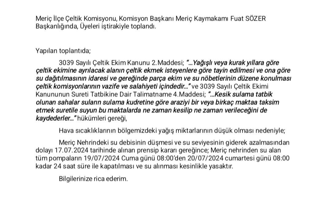 Alınan prensip kararı gereğince, Meriç Nehri'nden su alan tüm pompaların 19 Temmuz 2024 Cuma günü saat 08:00'den, 20 Temmuz 2024 Cumartesi günü saat 08:00'e kadar 24 saat boyunca kapatılması ve su alımının kesinlikle yasaklanması kararlaştırıldı.