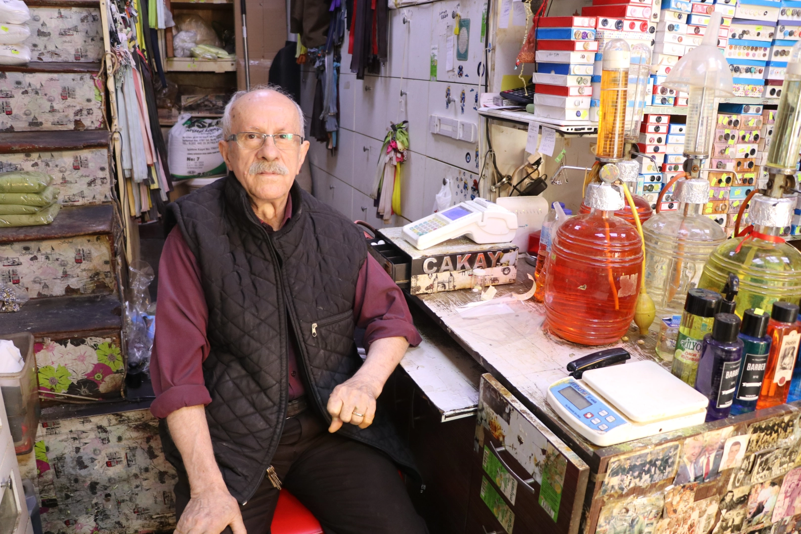 Çırak olarak başladığı esnaflıkta kendini yetiştirdiğini ve dükkanını açtığını belirten Çakay, "Dükkanımda iğneden ipliğe kadar binbir çeşit malzeme var. Biz de yok, yok. 70 yıla yaklaşan bir meslek yaşamım var. 10 yaşından beri buradayız. Esnaf olmak çok güzel bir şey. İçinden gelerek bu işi yapmak gerekli. Ben işe başladığım ilk günkü gibi heyecan ve zevkle çalışıyorum." dedi.