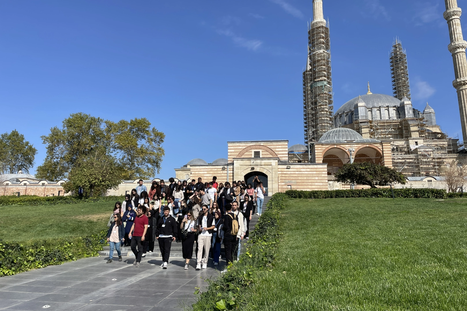 Katılımcılar, teknik gezilerin ilkine Selimiye Meydanı'ndan başladı. Camide ve meydanda incelemede bulunan öğrencilere, TÜ Mimarlık Fakültesinden Dr. Öğr. Üyesi Esin Benian tarafından bilgi verildi.