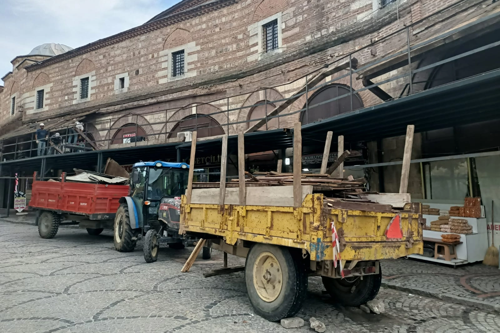 Çalışma nedeniyle kervansaray çevresine yaya trafiğini aksatmaması için tam korumalı iş iskeleleri kurulurken; hasarlı sundurmalar kaldırılmaya başladı.