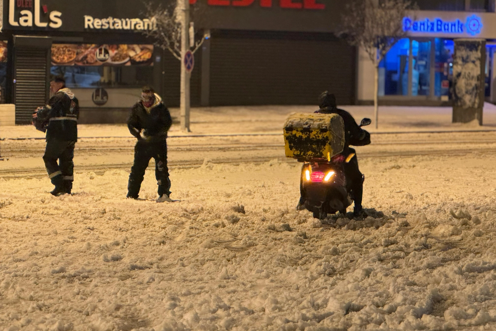 Kar yağışına sevinen moto kuryeler, adrenalin dolu bir tepki verdi. Atatürk Meydanı’na gelen kuryeler, motorlarla kar üzerinde drift gösterisi gerçekleştirdi.