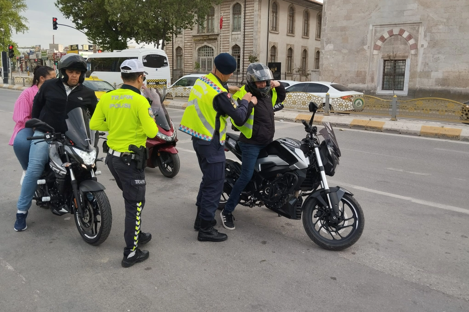 Polis ve Jandarma trafik ekipleri motor sürücülerine yönelik Eski Cami önünde uygulama yaptı. Uygulamada motor sürücülerine güvenli sürüş ve kask kullanımı konularında uyarı broşürleri dağıtan ekipler, motorcuların gece görünürlüğü konusunda yardımcı olan reflektörlü yelekler hediye ettiler.