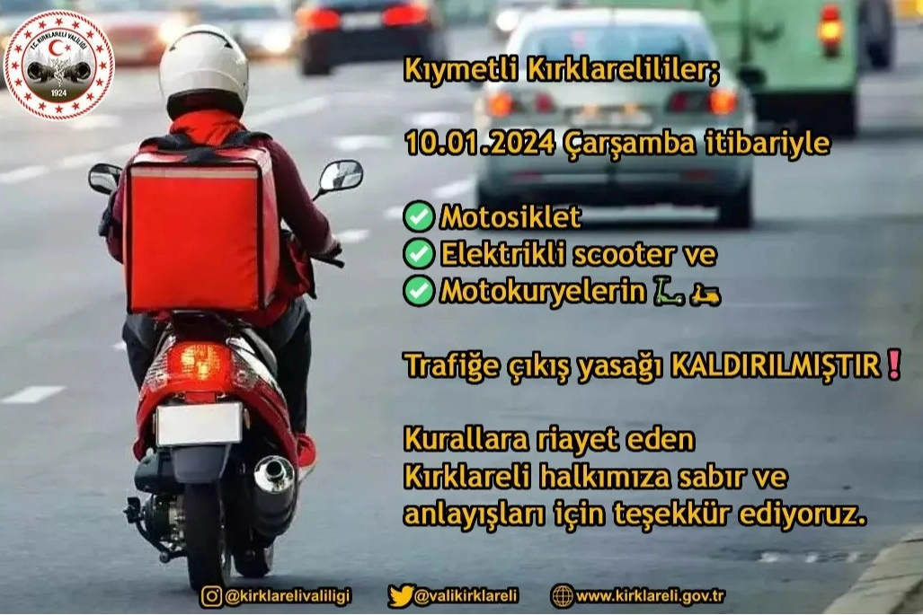 Tedbirler kapsamında can güvenliği için trafikte seyir etmeleri yasaklanan motosiklet, elektrikli bisiklet ve motokuryelere yönelik yasağın kaldırıldığı belirtilen açıklamada, "Kurallara riayet eden Kırklareli halkımıza sabır ve anlayışları için teşekkür ederiz" ifadelerine yer verildi.