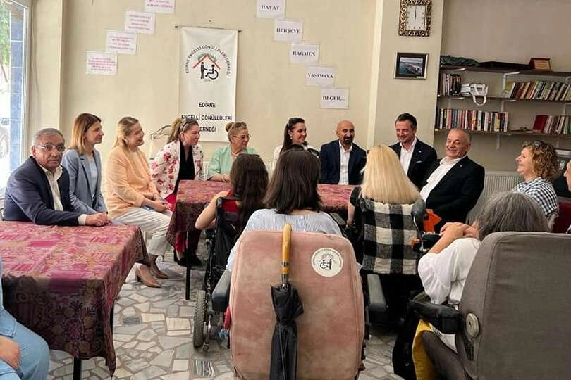 Heyet, Edirne Engelli Gönüllüleri Derneği Başkanı Serpil Erkenciler ve üyelerini ziyaret etti. Dernek üyeleri ile tek tek selamlaşıp konuşan Ayva, “Engelleri aşmak için birlikte mücadele ediyoruz. Yan yanayız, gönül gönüleyiz” dedi.