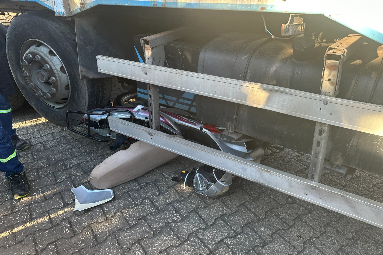 Motosiklet kamyonun altına girerken, sürücüsü şans eseri ezilmekten son anda kurtuldu. İhbar üzerine olay yerine sağlık ve emniyet ekipleri sevk edildi. Yaralı, ambulansla hastaneye kaldırıldı. Kazaya ilişkin inceleme başlatıldı.