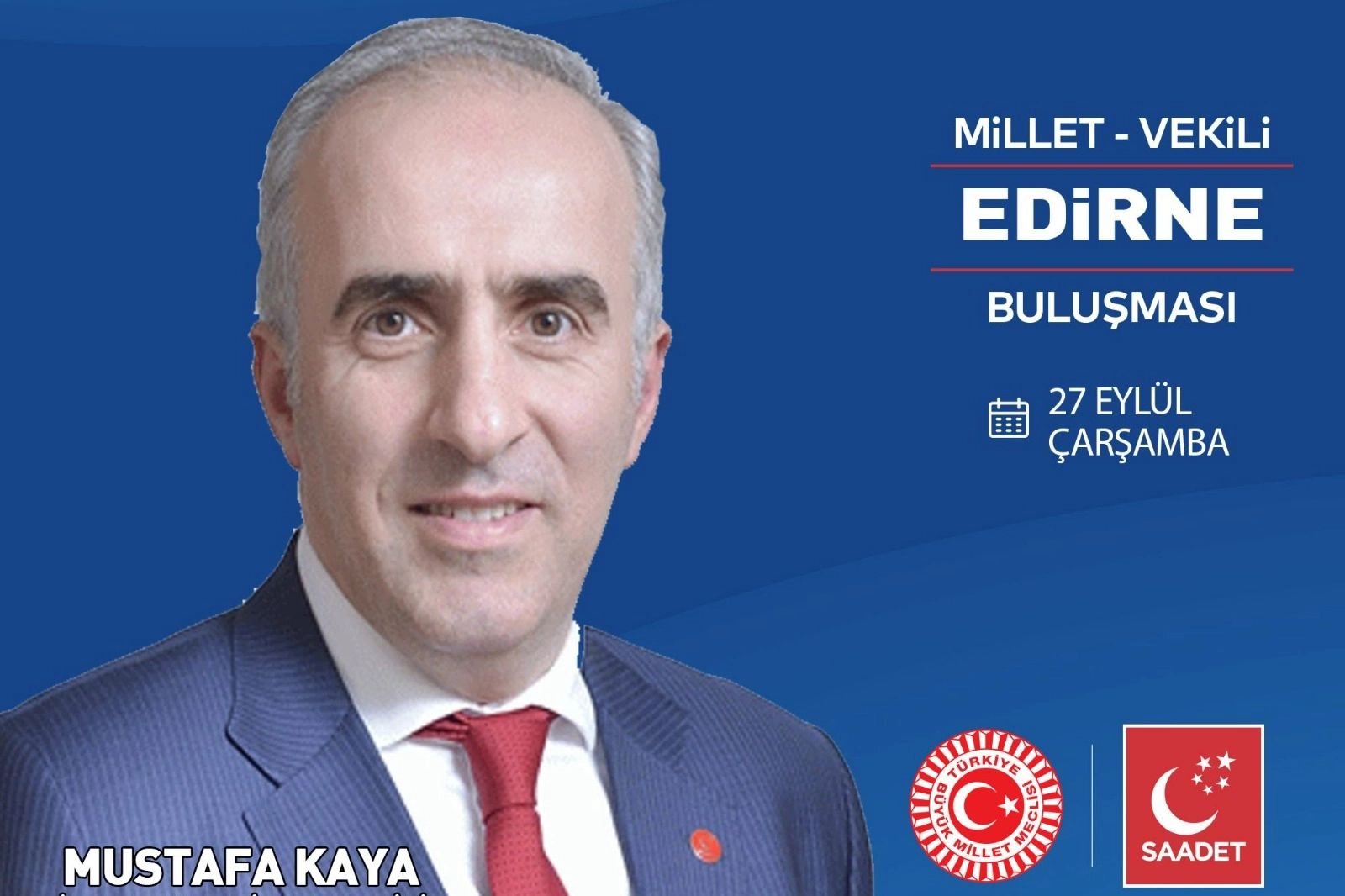 Saadet Partisi'nin "Milletin Vekilleri, Milletle buluşuyor" programı kapsamında Saadet Partisi Dış İlişkilerden Sorumlu Genel Başkan Yardımcısı ve İstanbul Milletvekili Mustafa Kaya Edirne'ye geliyor.