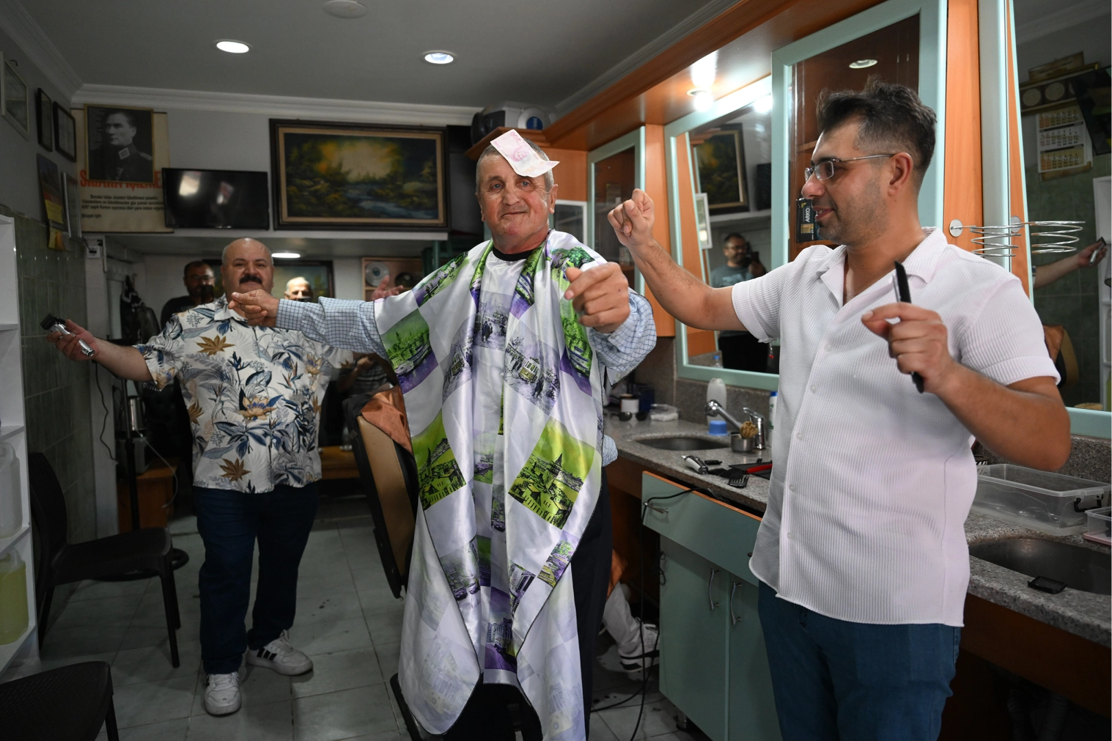 23 Kasım Caddesi'ndeki dükkanında 30 yıldır berberlik yapan Ceylan, müşterileriyle önce dertleşiyor, ardından müzik eşliğinde dans ederek türkü söylüyor.