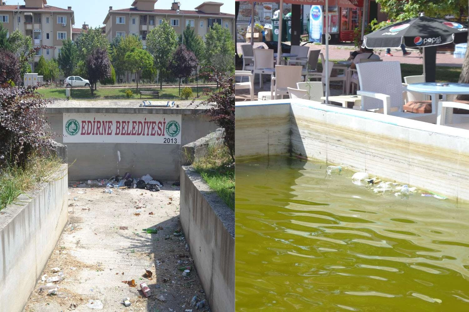 Edirne’de temizlik ve bakım sorumluluğu Belediye’ye ait olan süs havuzlarının bakımsızlığı ve kirliliği dikkat çekiyor. Çalışır durumdaki Uğur Mumcu Parkı’ndaki havuzun suyunun renginin yeşile dönmesi ve içinde bol miktarda çöp bulunması vatandaşların tepkisine yok açıyor. Ayrıca buradaki havuzun bir çay bahçesi içerisinde olması da hijyen konusunda riskleri beraberinde getiriyor.