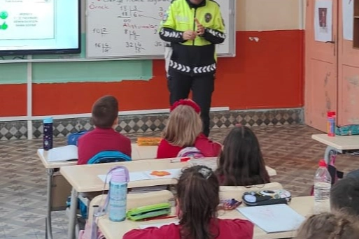 Eğitime katılan 60 öğrenci, temel trafik kuralları, trafikte yayaların uyması gereken kurallar ve okul servis araçlarında davranış kuralları konularında bilgilendirildi.
