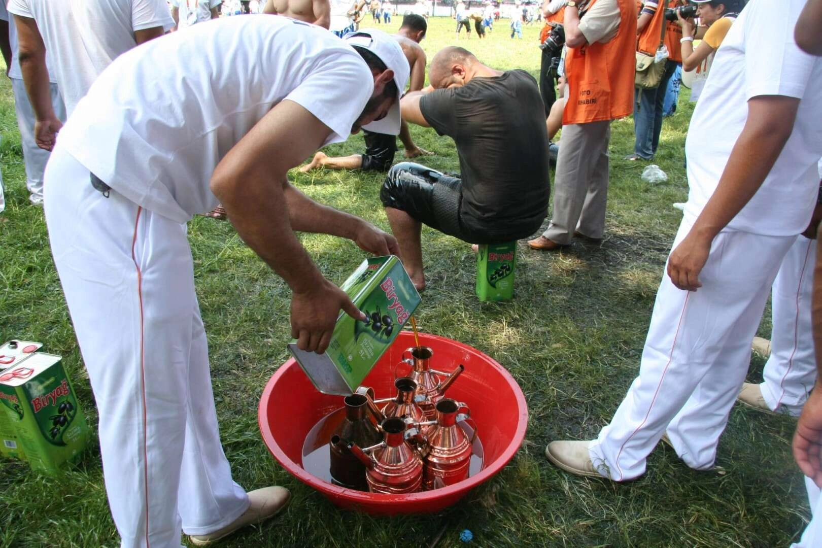 Kırkpınar Sarayiçi Er Meydanı Tesis Sorumlusu Ahmet Kıyı, AA muhabirine pehlivanların yağlanmasında zeytinyağı kullanıldığını ifade etti.