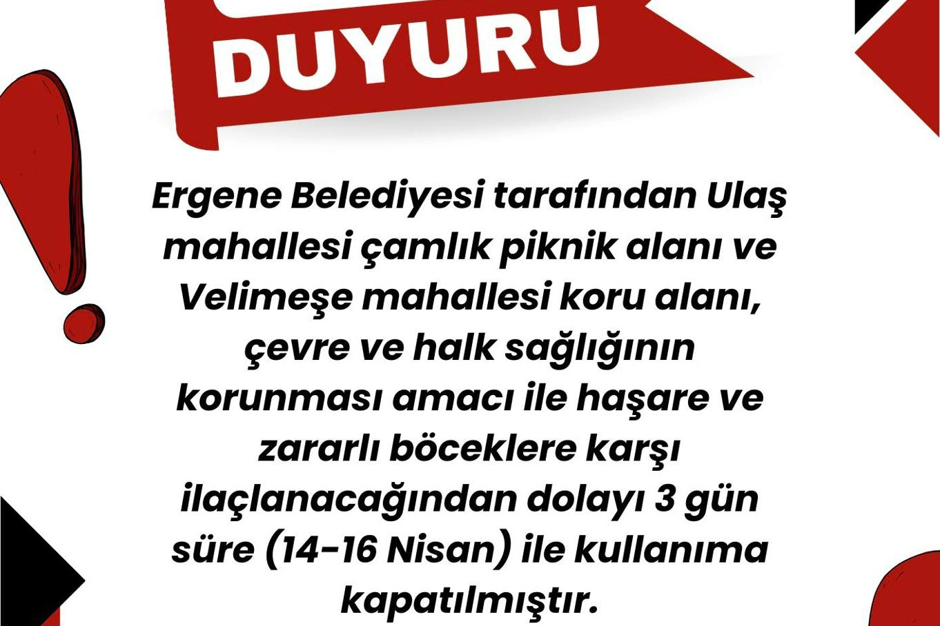 Tekirdağ’ın Ergene ilçesinde, Ulaş Mahallesi Çamlık Piknik Alanı ve Velimeşe Mahallesi Koru Alanı, zararlı böceklerle mücadele kapsamında 14-16 Nisan tarihleri arasında ilaçlama yapılacağı için ziyarete kapandı.