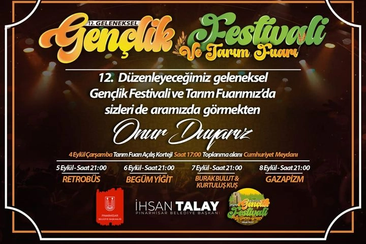 Pınarhisar Belediye Başkanı İhsan Talay, Pınarhisar Belediyesi tarafından düzenlenen Tarım Fuarı'nın bugün saat 17:00'de açılacağını duyurdu.