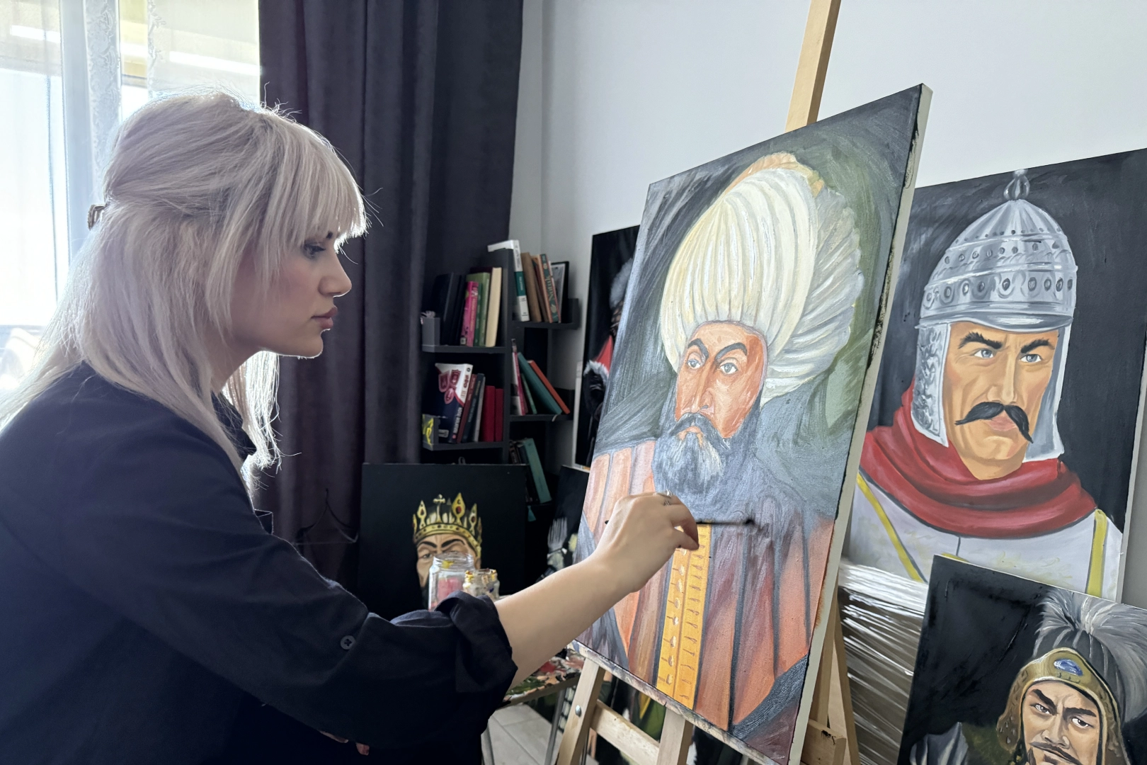 Ağırbaş, bugüne kadar farklı yüzleri resmettiğini belirterek, "Emniyet Müdürümüz Mehmet Hakan Fındık'ın sanatsal zevki, sanatçıya olan desteği ve teşvikiyle çok güzel bir dönemdeyiz. Kendisinin sunduğu imkanlar doğrultusunda şu an 16 Türk devletinin kurucularının portrelerini yapıyorum. Bu portrelerin birçoğu günümüze tasvir olarak ulaştığından ben bunları modern çağa uyarlıyorum. Bu çalışmayla insanların atalarımızı daha yakından tanımalarını istiyorum" ifadelerini kullandı.