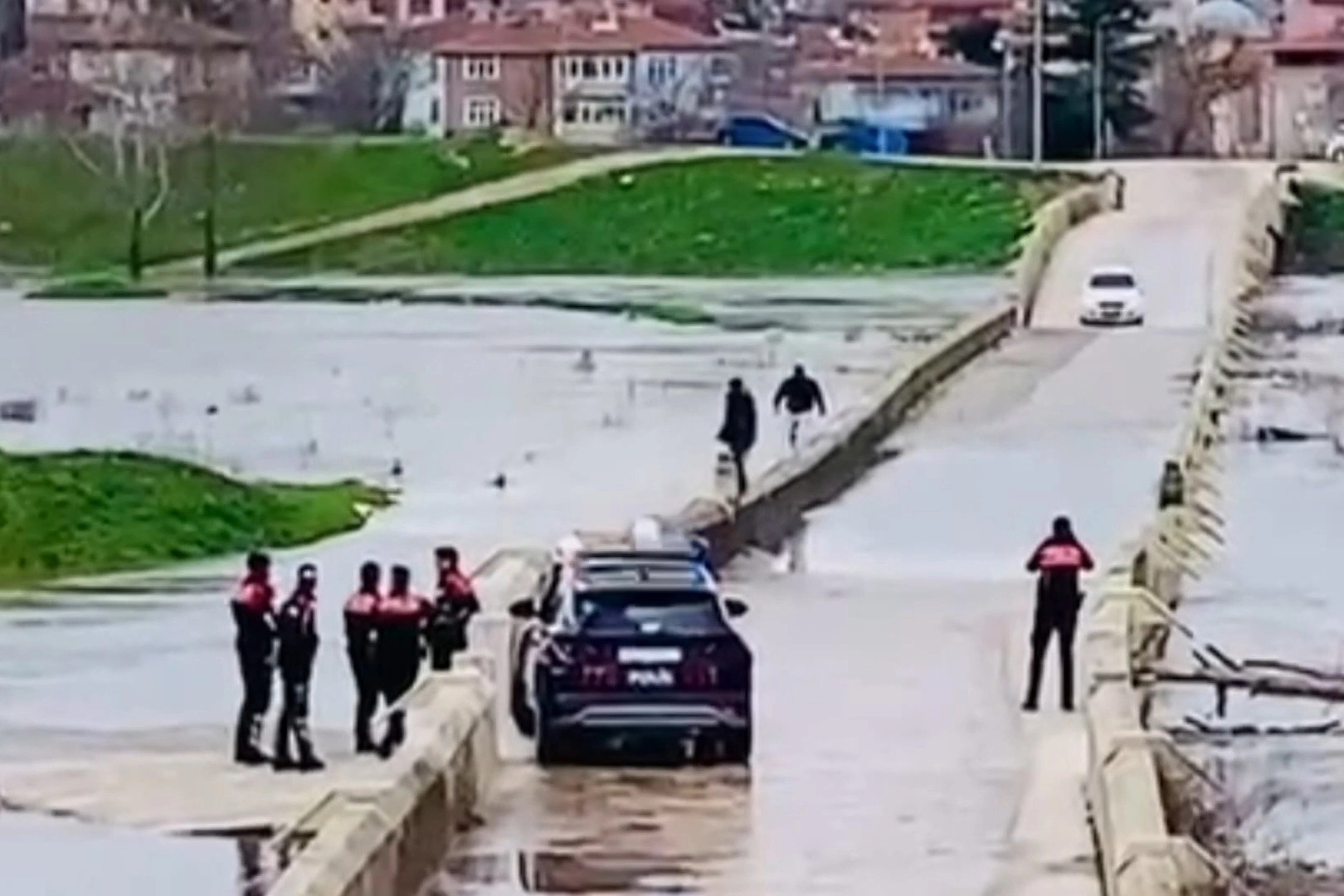 Edirne'de etkili olan yağışların ardından Yeniimaret Mahallesi ile şehir merkezini birbirine bağlayan Yalnız Göz Köprüsü'nün bir bölümü sularla kaplandı. Su seviyesinin yükselmesi nedeniyle köprünün bir kısmı kullanıma kapatılırken, şehir merkezine geçmek isteyen iki vatandaş polis ekiplerinin uyarılarına rağmen köprünün kanat kısmından yürüyerek karşıya geçmeye çalıştı. Tehlikeli anlar çevrede bulunan vatandaşlar tarafından endişeyle izlenirken, şahısların suya düşme riskiyle karşı karşıya kaldığı görüldü. Olayda herhangi bir olumsuzluk yaşanmadı. Yağış sonrası su seviyesinin yükseldiği bölgelerde güvenlik önlemleri sürerken, vatandaşların yapılan uyarılara uyması istendi.