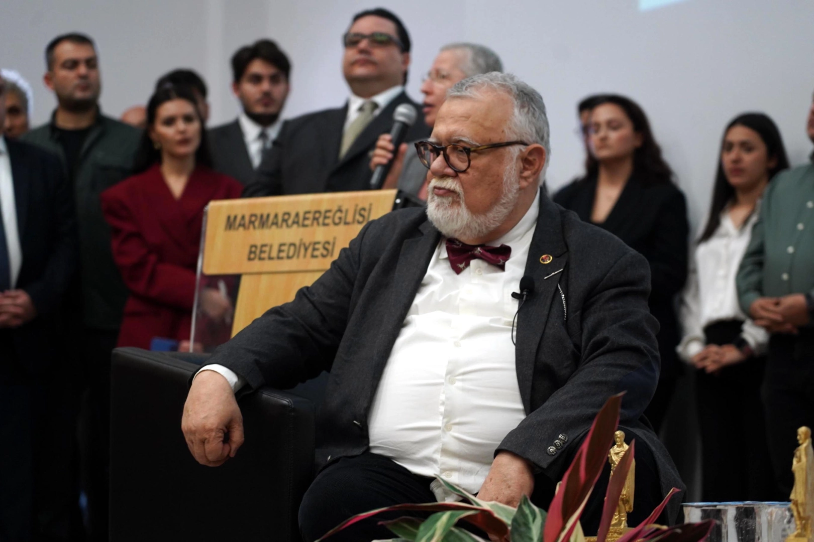 Konferansın ardından Marmaraereğlisi Belediye Başkanı Mustafa Onur Bozkurter tarafından Prof. Dr. Celal Şengör’e hediye takdim edildi.