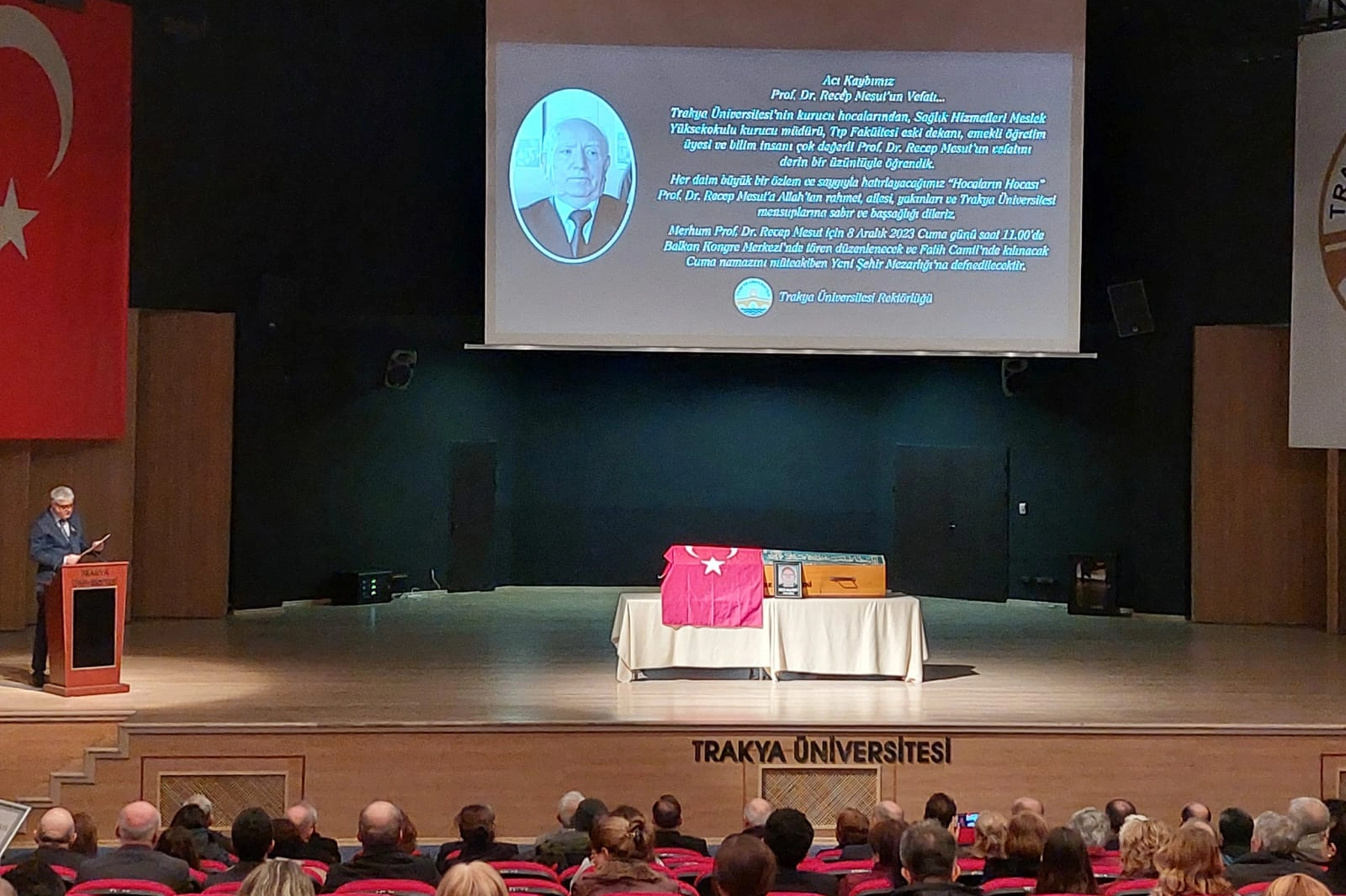Trakya Üniversitesi (TÜ) Tıp Fakültesi emekli öğretim üyesi Prof. Dr. Recep Mesut için TÜ Balkan Kongre Merkezi'nde tören yapıldı. Tören saygı duruşu, özgeçmişinin okunması ve konuşmalar ile devam etti.