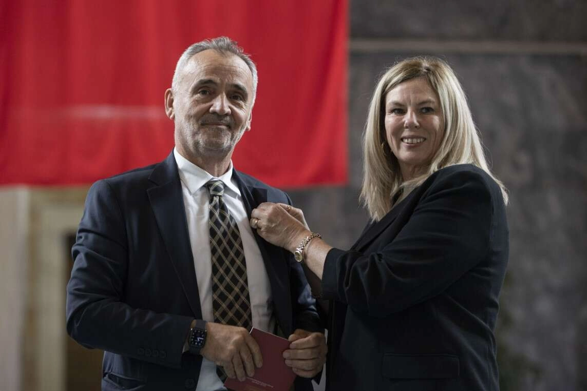 Kayıt işlemlerini tamamlayan Akalın'a rozetini eşi Keriman Akalın taktı.