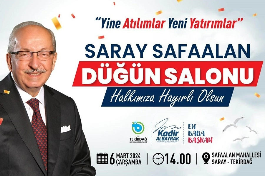 Tekirdağ Büyükşehir Belediyesi olarak il genelinde önemli yatırımları hayata geçirmeye devam ettiklerini belirten Tekirdağ Büyükşehir Belediye Başkanı Kadir Albayrak, “Yapımı tamamlanan Safaalan Düğün Salonu Projemizin açılışını yapacak olmanın mutluluğunu yaşıyoruz. Bu tesisimiz uzun yıllar boyunca halkımıza hizmet verecektir. Cumhuriyetimizin 100. yılında yüz yılın yatırımlarını Tekirdağ’a kazandırıyoruz. Sosyal, kültürel, sportif ve ulaşım alanında önemli projeleri hayata geçiriyoruz. Safaalan Düğün Salonumuzun hayırlı olmasını diliyor, vatandaşlarımızı açılış törenimizde bizlerle birlikte olmaya davet ediyorum” dedi.