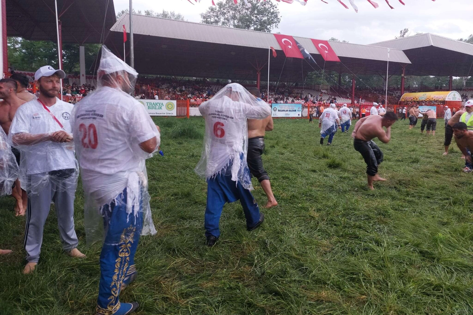 Edirne’de 662.si düzenlenen Tarihi Kırkpınar Güreşlerinin ilk gününde pehlivanlar, karşılaşmalar sırasında etkili olan sağanak altında güreşti.