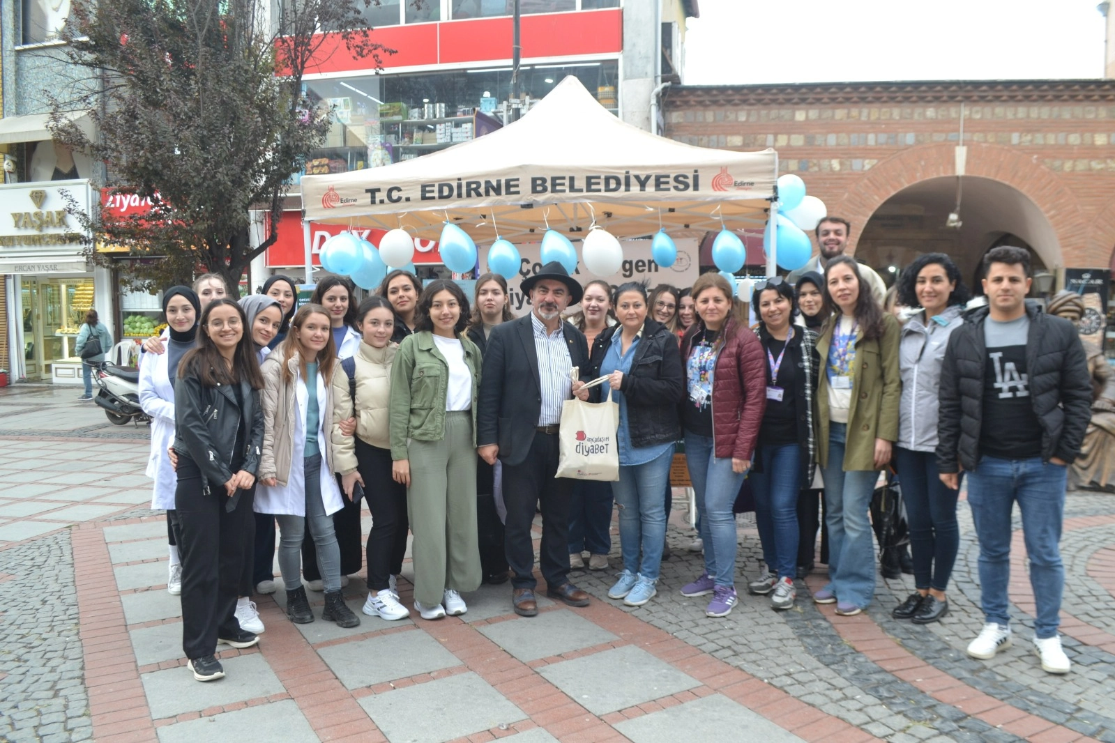 Trakya Üniversitesi Çocuk Ergen Diyabet ve Obezite Ünitesi’yle Edirne Belediyesi 14 Kasım Dünya Diyabet Günü dolayısıyla Edirne’de, Saraçlar Caddesi’nde stant açtı. Trakya Üniversitesi Sağlık Bilimleri, Halk Sağlığı hemşirelerinin, gün boyunca vatandaşlara kan şekeri ölçümleri, boy ve kilo taramalarının ve bilgilendirmelerin yapılacağı belirtildi. Etkinlik hakkında bilgiler veren Trakya Üniversitesi Çocuk Diyabet Eğitim Hemşiresi Leyla Avcıbaşı; “14 Kasım Dünya Diyabet farkındalık günü için Trakya Üniversitesi Çocuk Ergen Diyabet ve Obezite ünitesi olarak ve Trakya Üniversitesi Sağlık Bilimleri, Halk Sağlığı Hemşireleri olarak burada stant açtık. Halkı bilgilendirmek ve farkındalık yaratmak için buradayız. Kan şekeri ölçümleri yapacağız, broşürler dağıtacağız, hastaların boy ve kilolarına bakıp küçük bir tarama yapacağız” dedi.