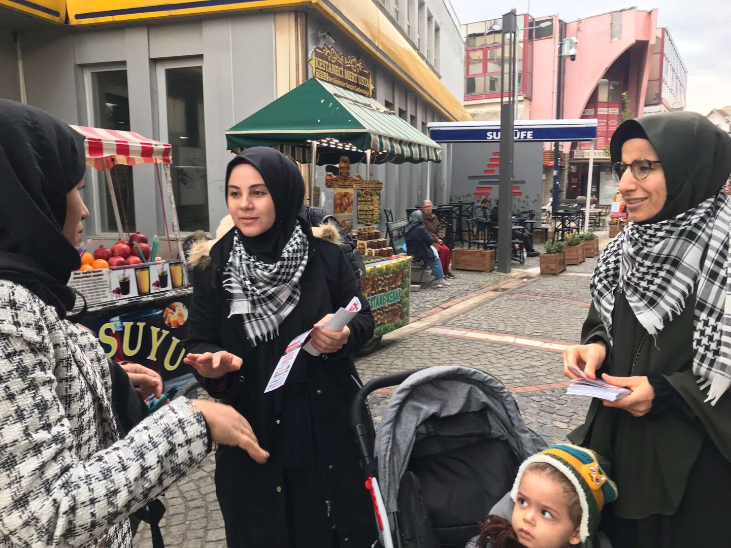 Meryem Demir ve arkadaşı Ceylan Altıntaş, Saraçlar Caddesi’nde Gazze’de ölen çocuklar için duyarlılık ve farkındalık oluşturmak adına hazırladıkları broşürleri dağıtıp İsrail ürünlerini boykot etti. Dil, din, ırk fark etmeksizin çocuğun her yerde çocuk olduğunu söyleyen Demir, bu anlayışla broşür hazırlayıp farkındalık oluşturmak adına arkadaşı Ceylan Altıntaş’la karar verdiklerini belirtti. Daha öncede duyarlılığı olduğunu fakat Gazze’de yaşanan savaşta katledilen çocuklara şahit olduktan sonra herkesin çocuğunun başına gelebileceğini söyledi. İki arkadaş çocuklarıyla beraber Saraçlar Caddesi’nde vatandaşları Türk markaları hakkında bilgilendirdi.