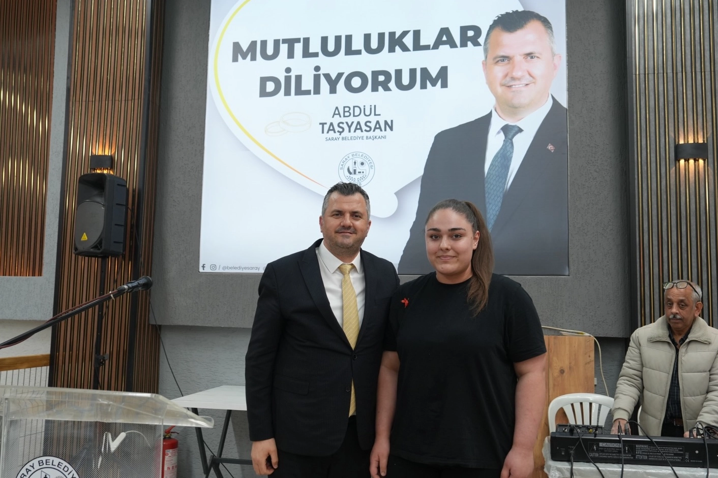 Ayrıca, Adana’da düzenlenen Okul Sporları Bilek Güreşi yarışmasında sağ kolda gümüş, sol kolda altın madalya kazanarak Türkiye Şampiyonu olan Büyükyoncalılı sporcu Sudenaz Kaya, Saray Belediyesi tarafından ödüllendirildi. Belediye yetkilileri, Sudenaz Kaya’yı yürekten kutlayarak başarılarının devamını diledi.