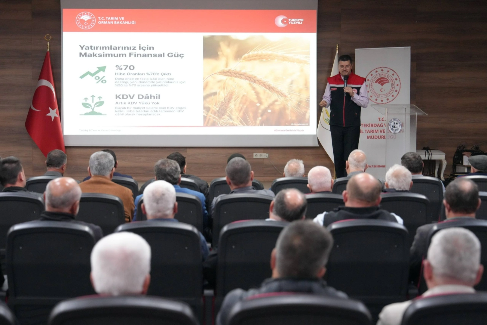 Tekirdağ İl Tarım ve Orman Müdürlüğü tarafından Saray Atatürk Kültür Merkezi’nde düzenlenen toplantıya Tekirdağ İl Tarım ve Orman Müdürü Mehmet Aksoy, Saray Belediye Başkanı Abdül Taşyasan, STK temsilcileri, muhtarlar, tarım paydaşları ve çiftçiler katıldı.