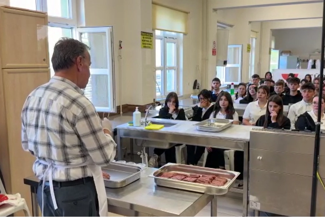 Köfteci İbrahim Burunluoğlu, okulun mutfağında öğrencilere tescilli Tekirdağ köftesi yapımının inceliklerini gösterdi.