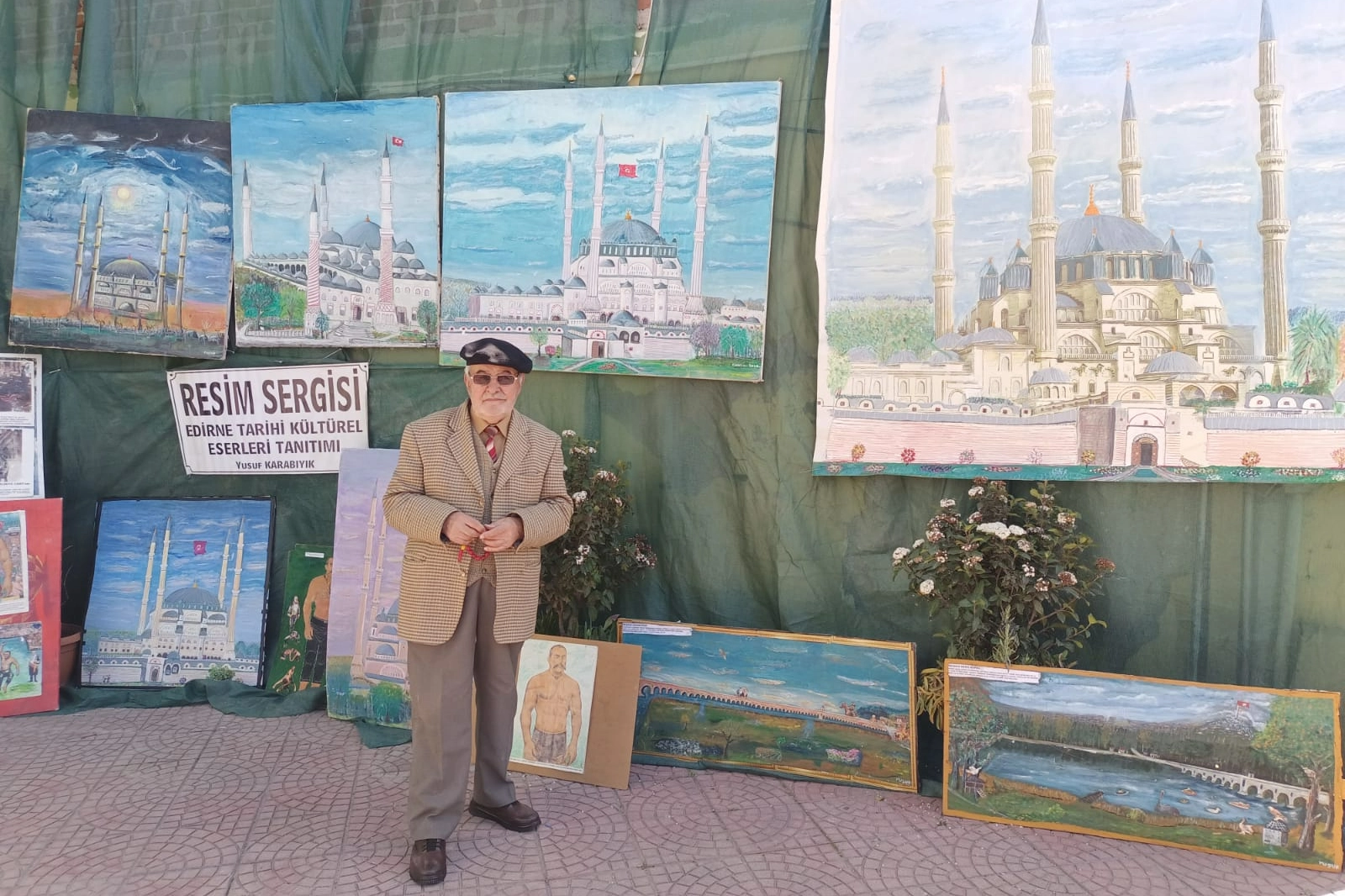 Edirne’de yaklaşık 54 yıldır tarihi eserleri ve kentin doğal güzelliklerini resmeden Selimiye Camii emekli baş müezzini Yusuf Karabıyık, Selimiye Camii’nin gölgesinde resim sergisi açtı.