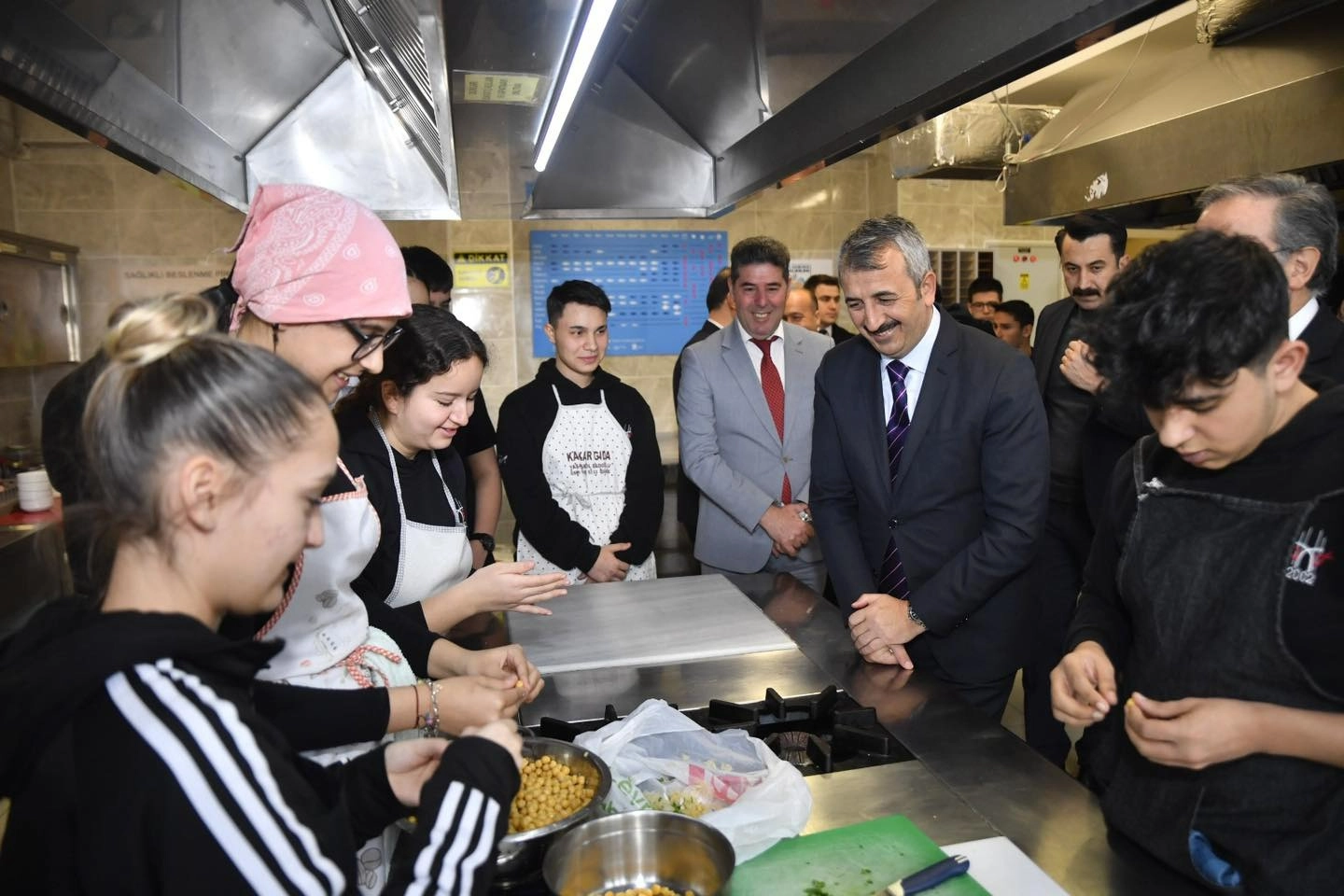 Öğrencileri eğitim gördükleri mutfakta ziyaret eden Vali Sezer, yiyeceklerin yapılış süreçleri ile ilgili öğrencilerden bilgi aldı.