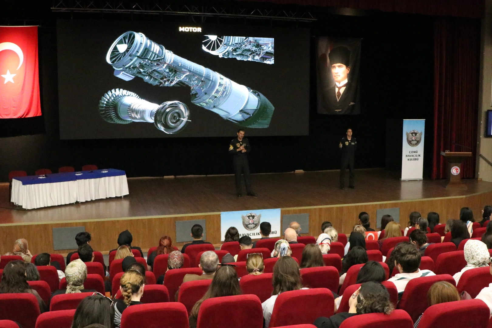 İÇDAŞ Kara Yusuf Kongre Merkezi'nde, ÇOMÜ Havacılık Kulübü'nün davetiyle düzenlenen etkinlikte, hava pilot binbaşı Murat Bakıcı ve hava pilot binbaşı Erhan Aydemir, öğrencilerle tecrübelerini paylaştı.