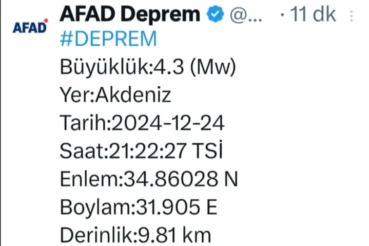 Afet ve Acil Durum Yönetimi Başkanlığının (AFAD) internet sitesinde yer alan bilgiye göre, Akdeniz'de saat 21.22'de 4,3 büyüklüğünde sarsıntı kaydedildi.
