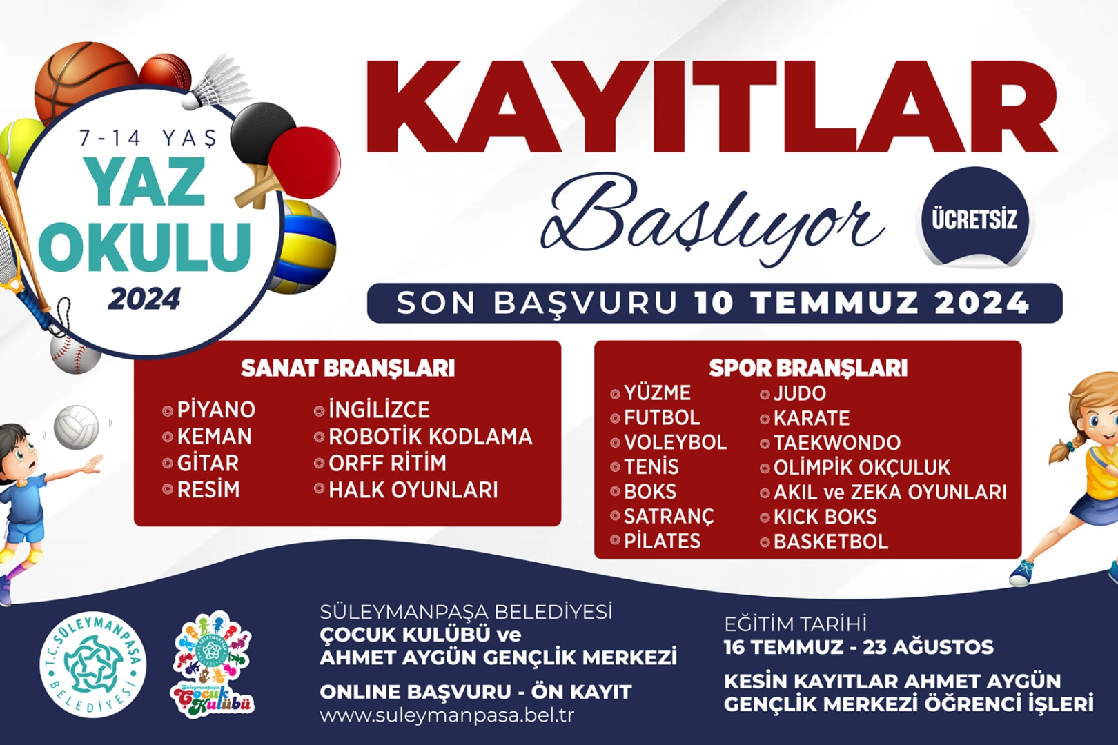 Tekirdağ’ın Süleymanpaşa Belediyesi, 2024 yılı yaz dönemi için ücretsiz yaz okulu kayıtlarının başladığını paylaştı. 7-14 yaş arasındaki çocuklara yönelik olarak düzenlenen yaz okuluna son başvuru tarihi 10 Temmuz 2024 olarak belirlendi.