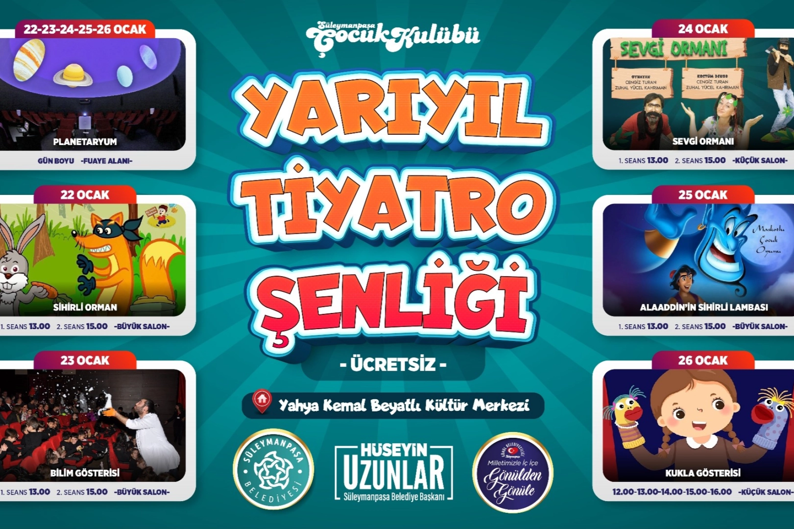 Yıllar içinde bir gelenek haline gelen Süleymanpaşa Belediyesi Çocuk Tiyatroları Şenliği bünyesinde, beş gün boyunca dolu dolu bir program çocukları bekliyor olacak. Süleymanpaşa Belediyesi Gençlik ve Spor Hizmetleri Müdürlüğü tarafından organize edilen Çocuk Tiyatrosu Şenliği, Yahya Kemal Beyatlı Kültür Merkezinde yapılacak. PLANETARYUM GÖSTERİSİ RENK KATACAK Birbirinden eğlenceli tiyatro ve gösterilerin yanı sıra şenlik süresince Planetaryum gösterisi de gün boyu çocukları YKB Kültür Merkezi ana sahne fuaye alanında misafir edecek. Tüm etkinlikler Süleymanpaşa Belediyesinin çocuklara karne armağanı olarak tamamen ücretsiz bir şekilde gerçekleşecek. BAŞKAN UZUNLAR'DAN TÜM ÇOCUKLARA DAVET Süleymanpaşa’da yaşayan çocuklara eğlenceli olduğu kadar eğitici ve verimli bir tatil geçirmeleri için destek olmak istediklerini ifade eden Süleymanpaşa Belediye Başkanı Hüseyin Uzunlar, “Çocuklarımız her şeyin en iyisine layık. Göreve geldiğimiz ilk günden bu yana çocuklarımızın okul ve sosyal hayatlarını daha kaliteli hale getirmek için çok sayıda projeyi hayata geçirdik. Tüm ilkokul öğrencilerimizin kırtasiye ihtiyaçlarını karşıladık, açtığımız sayısız kursla farklı alanlarda kendilerini geliştirmelerine katkı sağladık, akademik destek verdik, çeşitli yarışmalarla sanata özendirdik, şehrimizi spor tesisleri ile donatarak boş zamanlarını geçirebilecekleri çok sayıda alternatif sağladık. Artık geleneksel hale getirdiğimiz yarıyıl şenliğimizle çocuklarımızı tatilde de yalnız bırakmıyoruz. Çocuk Tiyatrosu şenliğimiz, tüm çocuklarımıza açık ve tamamen ücretsiz olacak. Tüm kardeşlerimizi karne sevinçlerini birlikte yaşamak üzere şenliğimize davet ediyoruz” dedi. ŞENLİK PROGRAMI Süleymanpaşa Belediyesi tarafından düzenlenen Yarıyıl Tiyatro Şenliği bünyesinde gerçekleşecek olan etkinliklerin programı ise şöyle: "22 Ocak Pazartesi: Sihirli Orman (13.00 ve 15.00 olmak üzere 2 seans), 23 Ocak Salı: Bilim Gösterisi (13.00 ve 15.00 olmak üzere 2 seans), 24 Ocak Çarşamba: Sevgi Ormanı (13.00 ve 15.00 olmak üzere 2 seans), 25 Ocak Perşembe: Alaaddin’in Sihirli Lambası (13.00 ve 15.00 olmak üzere 2 seans), 26 Ocak Cuma: Kukla Gösterisi (13.00 ve 15.00 olmak üzere 2 seans)."