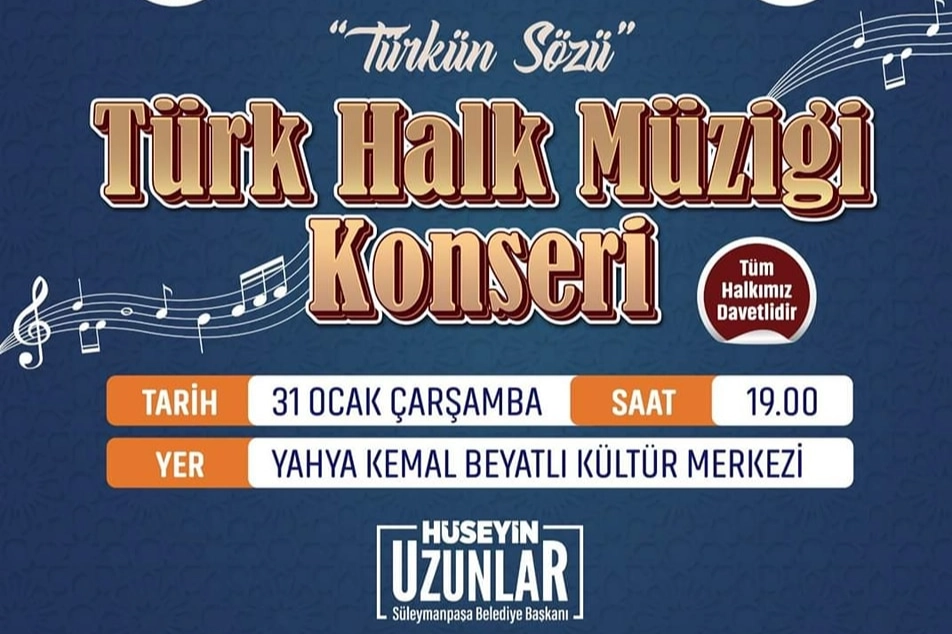 Tekirdağ’ın Süleymanpaşa Belediyesi, 31 Ocak Çarşamba günü Süleymanpaşa Belediye Konservatuvarı tarafından düzenlenecek olan Türk Halk Müziği Konserine tüm vatandaşları davet etti.