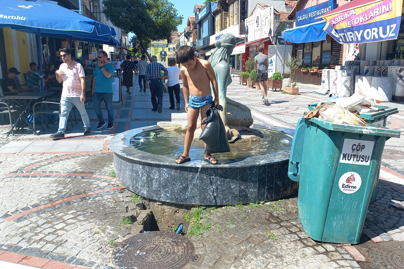 Edirne'de 40 dereceyi aşması üzerine sıcaktan bunalan bazı çocuklar, tehlikeli olmasına rağmen süs havuzlarına girerek serinlemeye çalışıyor. Tek başına yasak ve tehlikeli olmasının yanı sıra çevredekilerin uyarılarına aldırış etmeyen bir çocuğun dakikalarca havuzda oynayarak serinlemesi dikkat çekti. Süs havuzlarından bazılarında aydınlatma ve fıskiye için elektrik hattı bulunması ise tehlikeyi daha da artırıyor. Yetkililerin, özellikle süs havuzlarına girilmemesi konusundaki uyarılarını dikkate almayan çocuklar, tehlikeli serinlemeye devam ediyor.