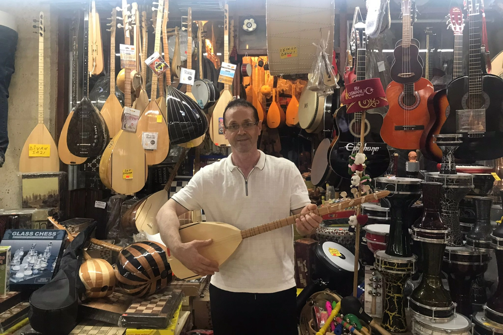 Denizeri, tarihi Ali Paşa Çarşısı’nda 45 yıldır esnaf olduğunu belirterek “Babamdan miras kalan bir iş. Babam çok iyi bir müzisyendi. O yüzden çekirdekten yetiştim. Kendime ait 5-6 tane bestem var. Söz ve müziği bana ait olanlar da var, tanımadığım insanların sözlerini getirip benim bestelediğim türküler de var. 35-40 senedir bağlama dersleri de veriyordum. Ama Covid’den sonra bıraktım” ifadelerini kullandı.
