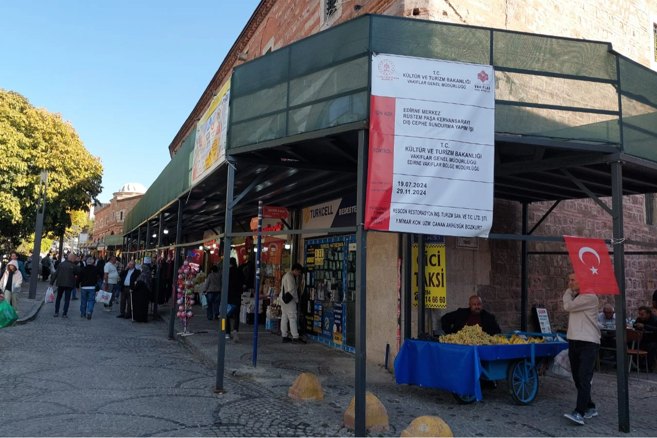 Edirne’de Kanuni Sultan Süleyman’ın Sadrazamı Rüstem Paşa tarafından Mimar Sinan’a yaptırılan tarihi Rüstem Paşa Kervansarayı’nda dış cephe sundurma yapım işi devam ediyor. Yaklaşık 500 yıllık kervansarayda, Vakıflar Bölge Müdürlüğü tarafından başlatılan dış cephe sundurma yapım işi çalışmalarında sona gelindi. 19.07.2024 tarihinde başlayan sundurma işinin, 29.11.2024 tarihinde sona ermesi tahmin ediliyor. Sundurma işlemlerinin tamamlanmasına 34 gün kaldı.