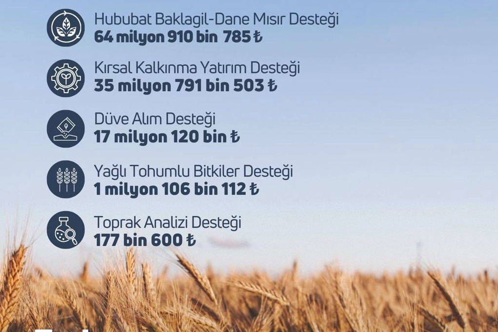 Tarım ve Orman Bakanlığı'nın sosyal medya hesabı üzerinden tarımsal destek ödemelerine ilişkin açıklama yapıldı. Açıklamaya göre, hububat-baklagil ve dane mısır desteği kapsamında 64 milyon 910 bin 785 lira, kırsal kalkınma yatırım desteği kapsamında 35 milyon 791 bin 503 lira, düve alım desteği kapsamında 17 milyon 120 bin lira, yağlı tohumlu bitkiler desteği kapsamında 1 milyon 106 bin 112 lira, toprak analizi desteği kapsamında 177 bin 600 lira olmak üzere toplam 119 milyon 106 bin liralık destekleme ödemesi çiftçilerin hesaplarına aktarıldı.
