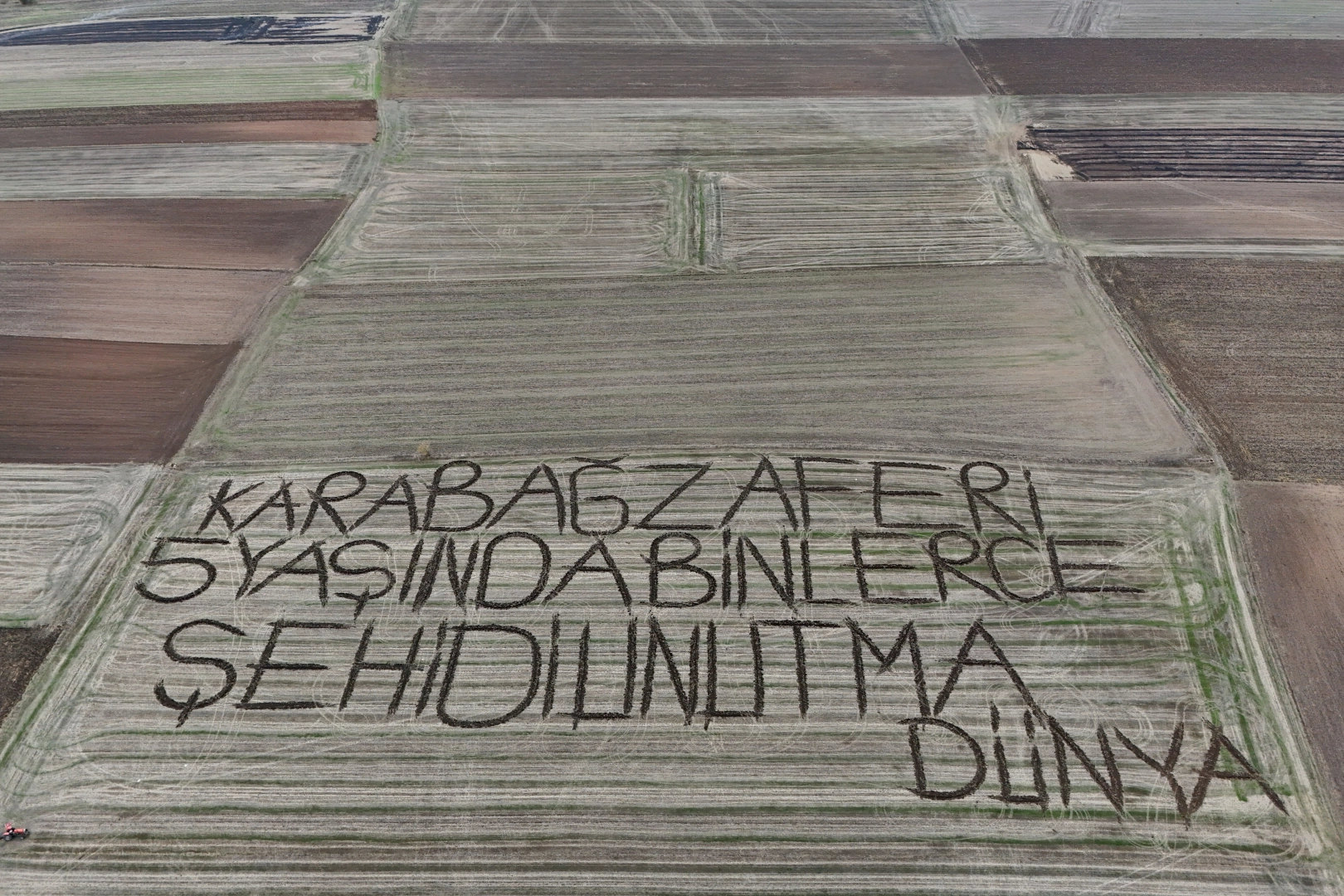 Traktörüne Türk ve Azerbaycan bayrakları asan Tunçkol, pullukla toprakta iz bırakarak yaklaşık 5 saatte "Karabağ Zaferi 5 yaşında, binlerce şehidini unutma dünya" yazdı.