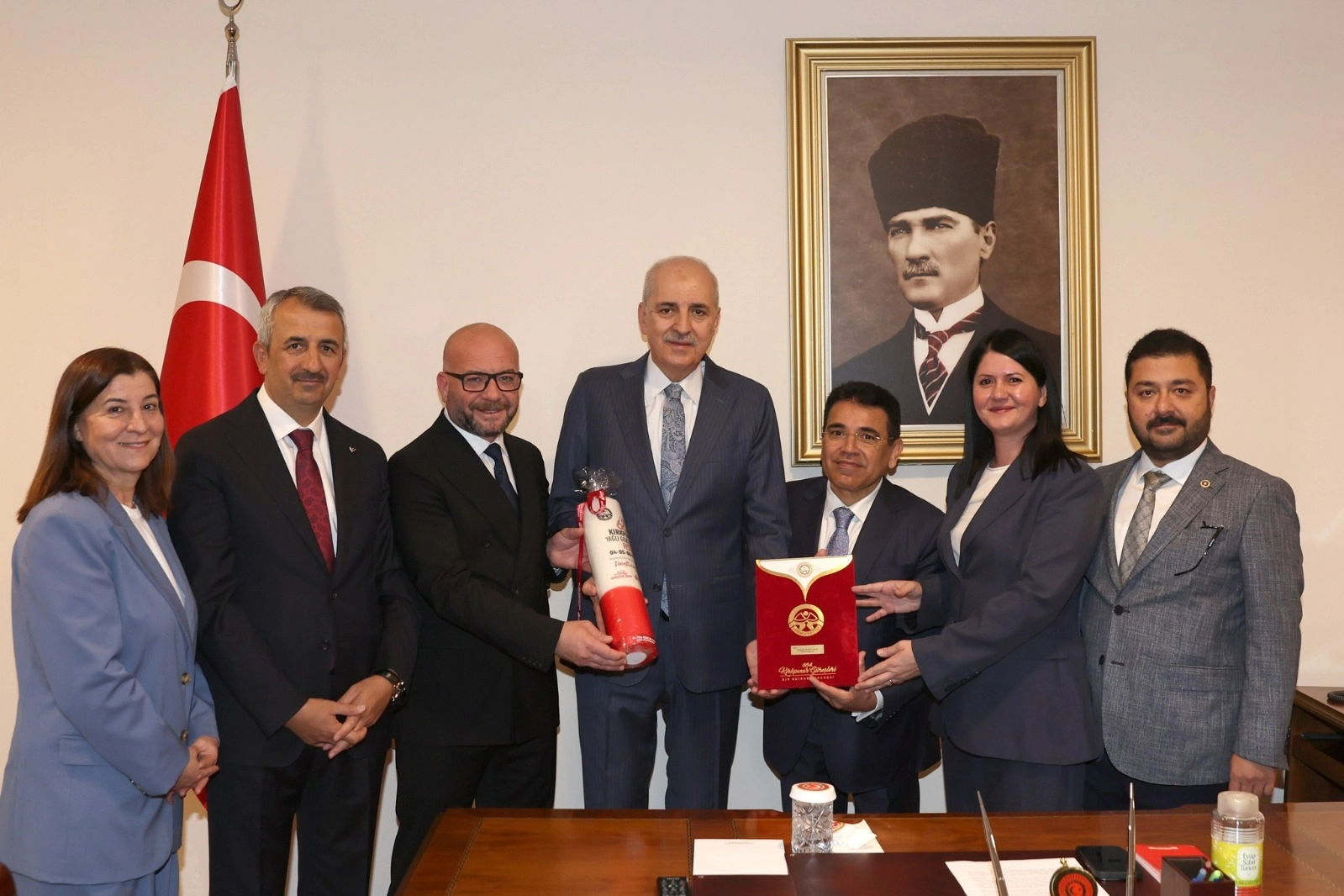 Türkiye Büyük Millet Meclisi Başkanı Numan Kurtuluş’u ziyaret eden Edirne heyeti Kurtuluş’un 4-5-6 Temmuz 2025 tarihlerinde Edirne’de yapılacak 664’üncü Kırkpınar Güreşlerine davet etti.