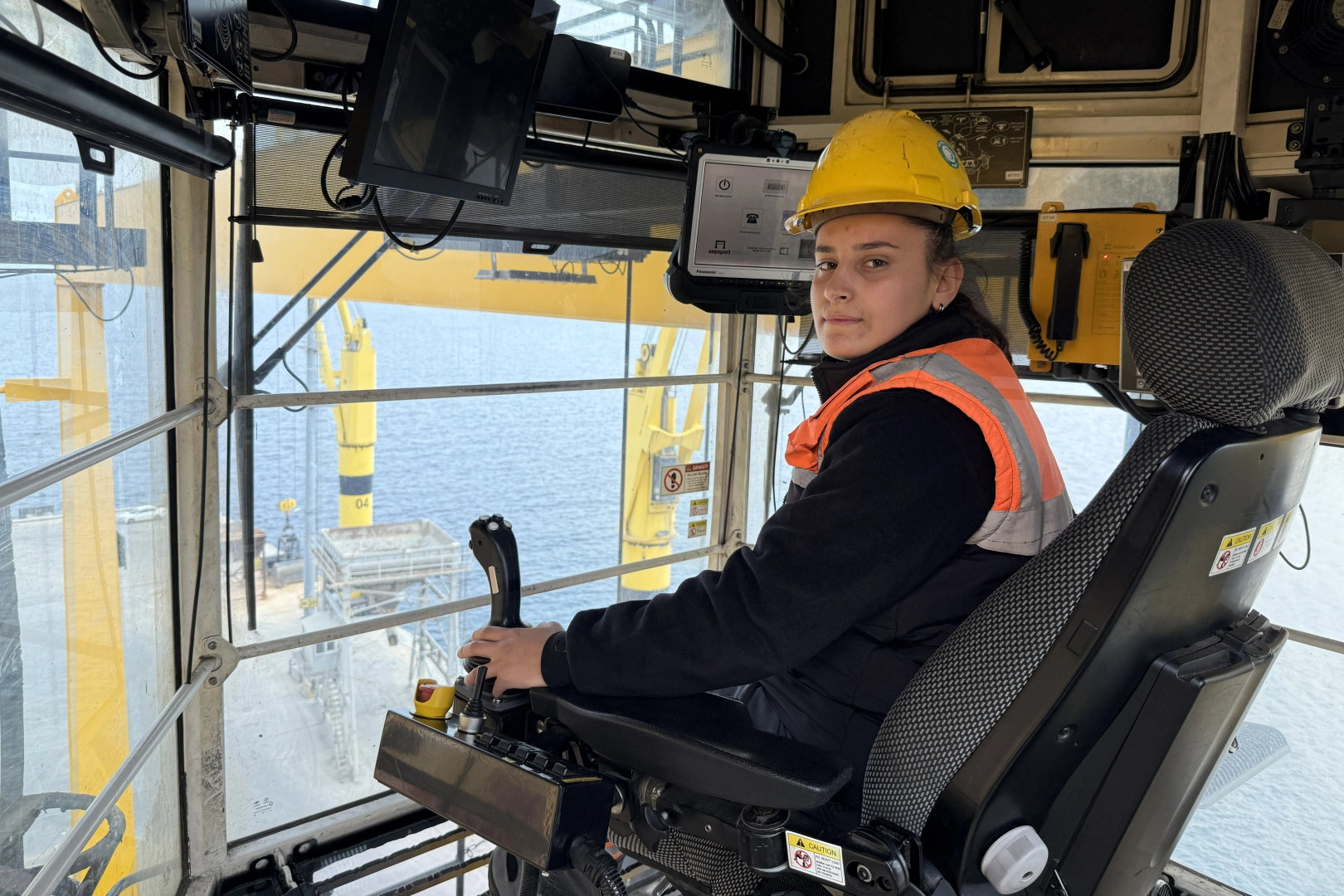 Her gün yaklaşık 22 metre yükseklikteki vinç kabinine çıkan genç operatör, kıyıya yanaşan gemilerin yükleme ve tahliye işlemlerinde görev alarak limanın ticaret trafiğine katkı sağlıyor.